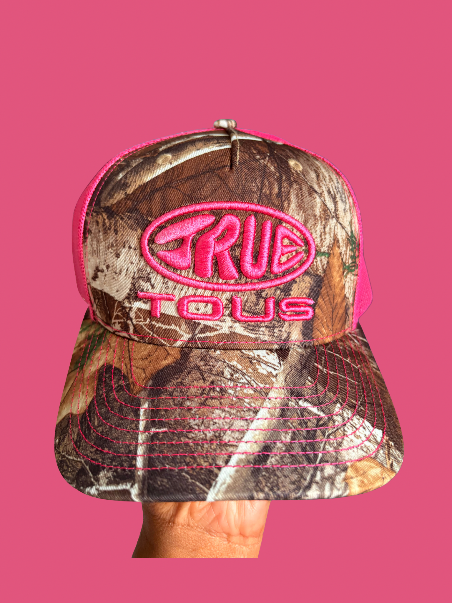 True to Us Logo Trucker in Real Tree Pink